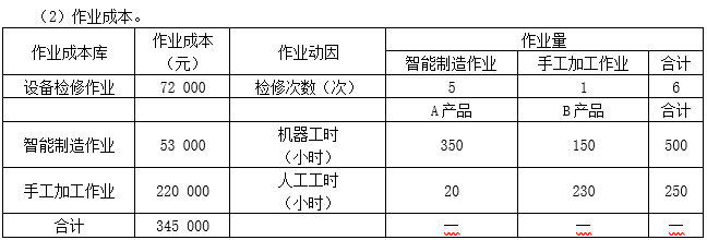 目前,A产品供不应求,B产品滞销。公司销售经理建议A提价,B降价,以提高公司获利能力。生产经理认为制造费用大部分由智能制造设备引起,按直接人工工资比例分配导致A、B产品成本计算不准确,应采用作业成本法对制造费用分配进行优化,从而为调价提供可靠的成本数据。公司财务部门和生产技术部门对生产过程进行了分析,识别出三项作业,分别是设备检修作业、智能制造作业和手工加工作业。设备检修作业负责对智能制造设备、手工加工设备进行检修,作业动因是检修次数;智能制造作业的作业动因是机器工时;手工加工作业的作业动因是人工工时。直接人工成本不再单列成本项目,被归入相应作业库。相关资料如下:
