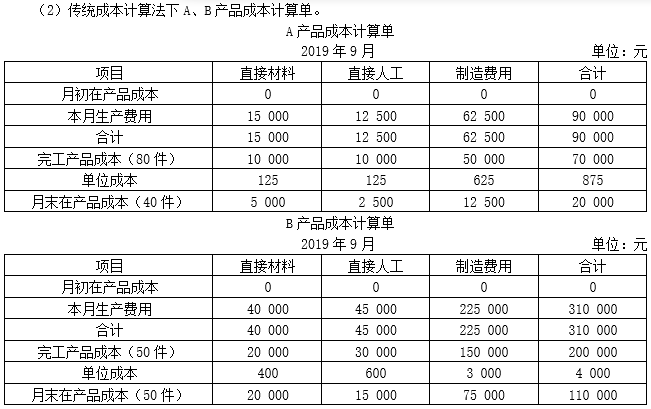 (2019年)甲公司是一家制造业企业,生产A、B两种产品。生产车间有两台设备,其中,一台属于高端智能制造设备,另一台属于手工加工设备。A、B产品均需先后经过智能制造和手工加工两道作业工序方可完成。A产品主要由智能制造设备完成,B产品主要由手工加工设备完成。原材料均在开工时一次性投入。公司现采用传统成本计算法计算成本,直接材料、直接人工直接计入产品成本,制造费用先按车间归集,再按直接人工工资比例分配计入产品成本。2019年9月生产成本相关资料如下: