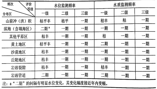 不同评价工作等级地下水环境现状监测频率的要求:(1)水位监测频率要求:②评价等级为二级的建设项目,若掌握近3年内至少一个连续水文年的枯、丰水期地下水位动态监测资料,评价期可不再开展现状地下水位监测:若无上述资料,依据下表开展水位监测。