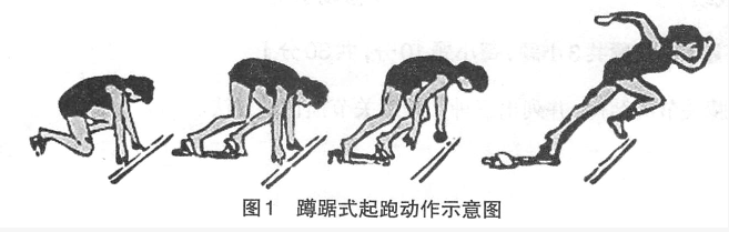 同学们,今天我们学习蹲踞式起跑,下面先看一下动作图解 (给同学们展示蹲踞式起跑动作示意图,见图1)。现在我给大家示范蹲踞式起跑动作, 并讲解动作要领,希望大家认真听和仔细观察。