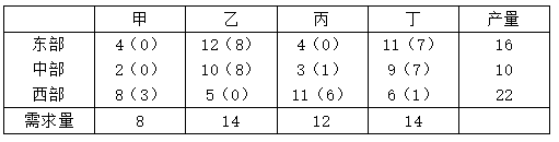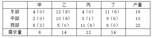 中部横看只有一个0,所以中部送甲,送完甲之后剩2个,东部可以送甲和丙,但是甲已经被送了所以只能送丙,送完丙剩4个,西部可以送乙和丁,先看乙,送完乙西部产量剩余8个,而丁需要14个,不够,所以东部和中部剩下的也送丁。