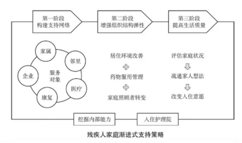社会工作者评估发现,该家庭信念系统消极(母亲拒药、拒助),组织结构缺乏弹性(外部资源少、居住环境恶劣、安全风险高),内部沟通互动少,家庭需求复杂,单靠内部力量难以应对。社会工作者计划采用综融服务方法,并设计了下图所示的“渐进式支持策略”开展服务: