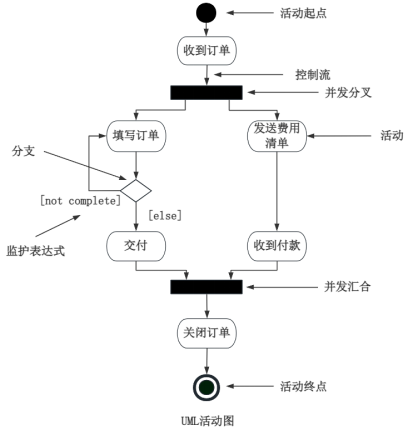 ③控制流:动作状态间的转换流,用带箭头直线表示,可加条件限制。