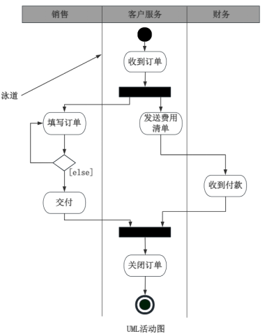⑥泳道:用垂直实线将活动分组指定给业务对象,明确活动归属。每个活动只属于一个泳道,不同泳道活动可顺序或并发进行。