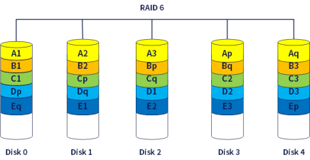 RAID-6和RAID-5一样对逻辑盘进行条带化然后存储数据和校验位,只是对每一位数据又增加了一位校验位。这样在使用RAID-6时会有两块硬盘用来存储校验位,增强了容错功能,同时必然会减少硬盘的实际使用容量。以前的raid级别一般只允许一块硬盘坏掉,而RAID-6可以允许坏掉两块硬盘,因此,RAID-6要求至少4块硬盘。2个独立的RAID组,且配备1块全局热备盘则至少需要2×4+1=9块硬盘。