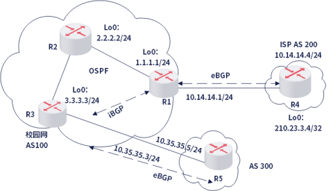 【说明】某网络拓扑如下图所示,路由器R1、R2、R3通过OSPF实现网络互通,R1和R3建立iBGP邻居关系,R3和R5建立eBGP邻居关系,R1和R4建立eBGP邻居关系。
