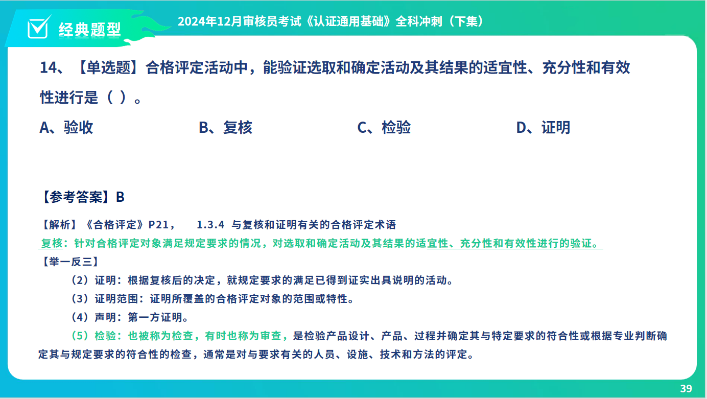 《合格评定基础》P84,复核的管理。复核是针对合格评定对象满足规定要求的情况下,对合格评定活动的选取与确定活动及其结果的适宜性、充分性及有效性进行的验证,也可将复核称为审查、核查或审定。