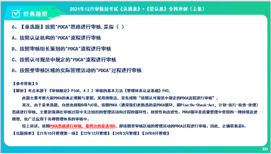 其次,由于是单选题,自然也排除B项与C项,按照PDCA(通常我们更熟悉的是PDCA循环,即Plan-Do-Check-Act,计划-执行-检查-处理)思路进行审核,主要是强调在审核过程中关注组织的管理活动和过程的循环性、持续性和改进性。PDCA循环是质量管理中常用的一种持续改进模型,也广泛应用于各种管理体系的审核中。