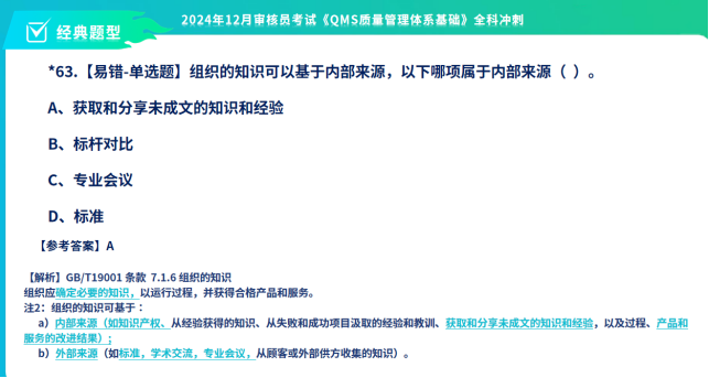 【举一反三】外部来源(如标准、学术交流、专业会议、从顾客或外部供方收集的知识)。