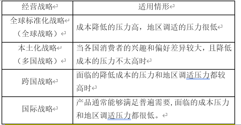 当降低成本压力和地区调适压力都很高时,跨国公司适合采用的经营战略是( )。