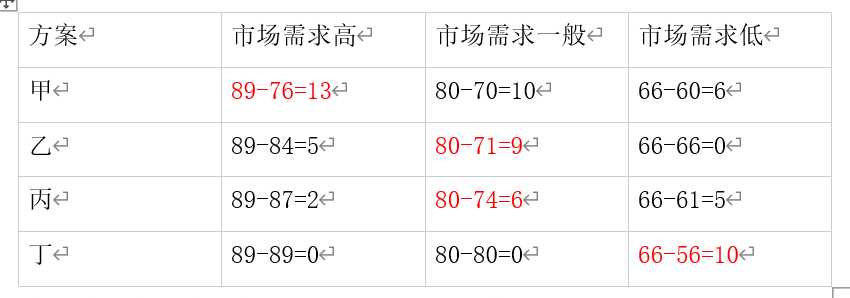 各方案最大后悔值为{13,9,6,10},取其最小值=6,对应的方案丙即用最小后悔值法选取的方案。