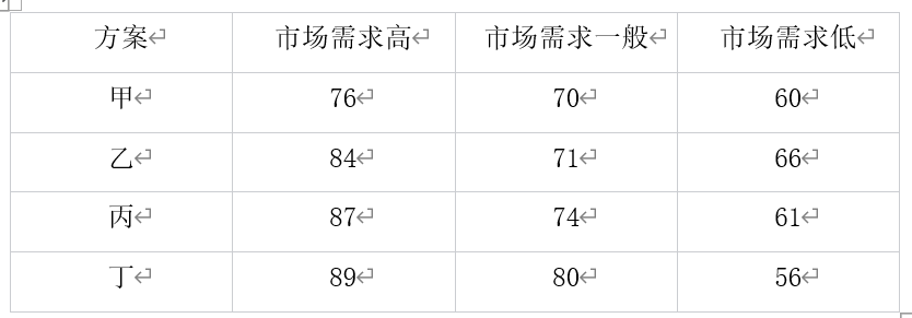 M公司为茶饮料生产企业,采用价值链分析法分析其价值制造活动,采用波士顿矩阵分析产品的竞争力。在充分进行内外部战略环境分析的基础上,公司明确了战略方向,该公可采用贴牌生产和特许经营的形式与其他企业建立战略联盟。以期全面提高企业产品的市场占有率和市场竞争力。该公司积极研发新产品,并出资金在某大学建立技术实验室,研究新技术。研究出四种饮料方案可供选择,具有甲、乙、丙、丁四种饮料产品方案可供选择,每种产品均存在市场需求高,市场需求一般,市场需求低三种市场状态:对应的损益值(单位:百万元)如下表。