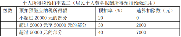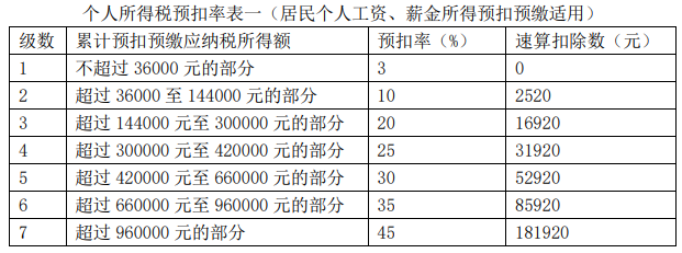 附:个人所得税预扣率表一( 居民个人工资、薪金所得预扣预缴适用),个人所得税预扣率表二(居民个人劳务报酬所得预扣预缴适用)。