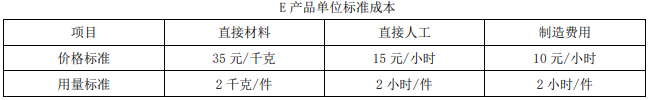 资料一:2014年E产品实际产销量为3680件,生产实际用工为7000小时,实际人工成本为16元/小时。标准成本资料如下表所示。