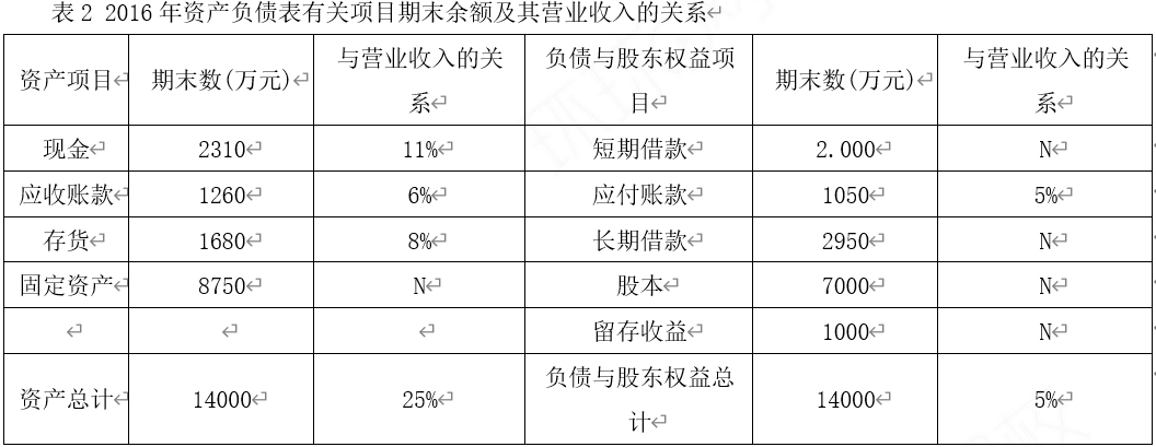 资料二:戊公司2016年末资产负债表有关项目余额及其与营业收入的关系如表2 所示。