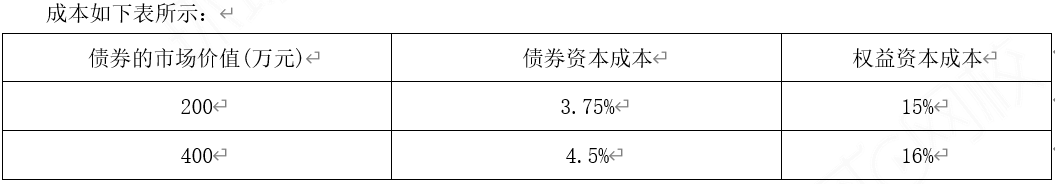 某公司年度息税前利润为500万元,资金全部由股东权益资本组成,所得税税率为25%。 该公司今年年初认为资本结构不合理,准备用发行债券购回部分股票的办法予以调整。 经过咨询调查,当时的债券资本成本(平价发行,不考虑手续费和时间价值)和权益资本