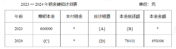 甲企业于2023年1月1日从租赁公司租入一套设备,价值600000元,租期6年,租赁期满时预计残值50000元,归租赁公司。年利率8%,租赁手续费率每年2%。租金每年年未支付一次,相关货币时间减值系数:(P/F,8%,6)=0.6302,(P/A,8%,6)=4.6229,(PF,10%,6)=0.5645,(P/A,10%,6)=4.3553,部分租金摊销计划表如下: