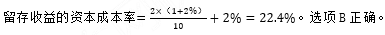 某公司发行普通股的筹资费率为6%,当前股价为10元/股,本期已支付的现金股利为2元/股,未来各期股利按2%的速度持续增长。则该公司留存收益的资本成本率为( )。