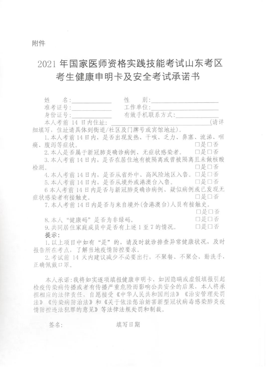 一、考前监测:考前考生须进行流行病学史申报和自我健康检测,考前一天填写《考生健康申明卡及安全考试承诺书》(附件),于考试当天上交。瞒报、虚报个人旅居史和健康症状的,依法依规予以处理。山东省以外地区考生须提前申领“山东省健康通行码”。
